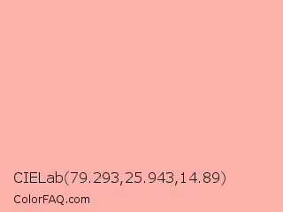 CIELab 79.293,25.943,14.89 Color is a very light red color and the nearest color is Cornflower Lilac #ffb0ac. Hex code #fcb2aa and RGB value is rgb(252,178,170). In RGB color space, this color is composed of 99% red, 70% green, 67% blue, In CMYK color space, this color is composed of 0% cyan, 29% magenta, 33% yellow , 1% black , In HSL color space, this color has a hue angle of 6° , 93% saturation and 83% lightness.