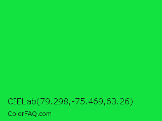 CIELab 79.298,-75.469,63.26 Color is a normal green color and the nearest color is Malachite #0bda51. Hex code #13e340 and RGB value is rgb(19,227,64). In RGB color space, this color is composed of 7% red, 89% green, 25% blue, In CMYK color space, this color is composed of 92% cyan, 0% magenta, 72% yellow , 11% black , In HSL color space, this color has a hue angle of 133° , 85% saturation and 48% lightness.