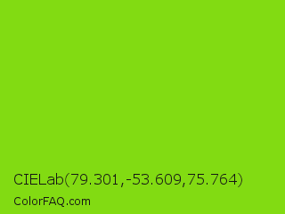 CIELab 79.301,-53.609,75.764 Color is a normal green color and the nearest color is Alien Armpit #84de02. Hex code #82db12 and RGB value is rgb(130,219,18). In RGB color space, this color is composed of 51% red, 86% green, 7% blue, In CMYK color space, this color is composed of 41% cyan, 0% magenta, 92% yellow , 14% black , In HSL color space, this color has a hue angle of 87° , 85% saturation and 46% lightness.