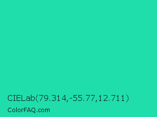 CIELab 79.314,-55.77,12.711 Color is a normal cyan color and the nearest color is Shamrock #33cc99. Hex code #1fdeab and RGB value is rgb(31,222,171). In RGB color space, this color is composed of 12% red, 87% green, 67% blue, In CMYK color space, this color is composed of 86% cyan, 0% magenta, 23% yellow , 13% black , In HSL color space, this color has a hue angle of 164° , 75% saturation and 50% lightness.