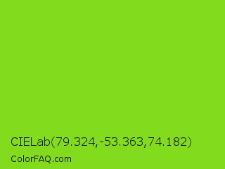 CIELab 79.324,-53.363,74.182 Color is a normal green color and the nearest color is Alien Armpit #84de02. Hex code #82db1c and RGB value is rgb(130,219,28). In RGB color space, this color is composed of 51% red, 86% green, 11% blue, In CMYK color space, this color is composed of 41% cyan, 0% magenta, 87% yellow , 14% black , In HSL color space, this color has a hue angle of 88° , 77% saturation and 48% lightness.