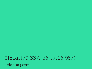 CIELab 79.337,-56.17,16.987 Color is a normal green color and the nearest color is Shamrock #33cc99. Hex code #30dea3 and RGB value is rgb(48,222,163). In RGB color space, this color is composed of 19% red, 87% green, 64% blue, In CMYK color space, this color is composed of 78% cyan, 0% magenta, 27% yellow , 13% black , In HSL color space, this color has a hue angle of 160° , 73% saturation and 53% lightness.