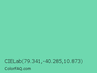 CIELab 79.341,-40.285,10.873 Color is a light green color and the nearest color is Medium Aquamarine #66ddaa. Hex code #6ed8af and RGB value is rgb(110,216,175). In RGB color space, this color is composed of 43% red, 85% green, 69% blue, In CMYK color space, this color is composed of 49% cyan, 0% magenta, 19% yellow , 15% black , In HSL color space, this color has a hue angle of 157° , 58% saturation and 64% lightness.
