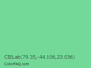 CIELab 79.35,-44.106,23.036 Color is a light green color and the nearest color is Medium Aquamarine #66ddaa. Hex code #73d998 and RGB value is rgb(115,217,152). In RGB color space, this color is composed of 45% red, 85% green, 60% blue, In CMYK color space, this color is composed of 47% cyan, 0% magenta, 30% yellow , 15% black , In HSL color space, this color has a hue angle of 142° , 57% saturation and 65% lightness.