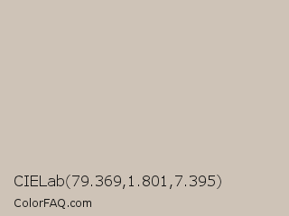 CIELab 79.369,1.801,7.395 Color is a light orange color and the nearest color is Soft Amber #d1c6b4. Hex code #cec3b7 and RGB value is rgb(206,195,183). In RGB color space, this color is composed of 81% red, 76% green, 72% blue, In CMYK color space, this color is composed of 0% cyan, 5% magenta, 11% yellow , 19% black , In HSL color space, this color has a hue angle of 31° , 19% saturation and 76% lightness.