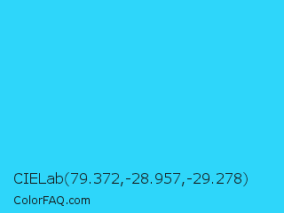 CIELab 79.372,-28.957,-29.278 Color is a normal cyan color and the nearest color is Loeen #15f2fd. Hex code #2ed6fa and RGB value is rgb(46,214,250). In RGB color space, this color is composed of 18% red, 84% green, 98% blue, In CMYK color space, this color is composed of 82% cyan, 14% magenta, 0% yellow , 2% black , In HSL color space, this color has a hue angle of 191° , 95% saturation and 58% lightness.