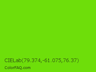 CIELab 79.374,-61.075,76.37 Color is a normal green color and the nearest color is Alien Armpit #84de02. Hex code #6ede0a and RGB value is rgb(110,222,10). In RGB color space, this color is composed of 43% red, 87% green, 4% blue, In CMYK color space, this color is composed of 50% cyan, 0% magenta, 95% yellow , 13% black , In HSL color space, this color has a hue angle of 92° , 91% saturation and 45% lightness.