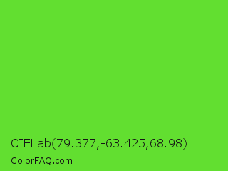 CIELab 79.377,-63.425,68.98 Color is a normal green color and the nearest color is Harlequin Green #46cb18. Hex code #62df30 and RGB value is rgb(98,223,48). In RGB color space, this color is composed of 38% red, 87% green, 19% blue, In CMYK color space, this color is composed of 56% cyan, 0% magenta, 78% yellow , 13% black , In HSL color space, this color has a hue angle of 103° , 73% saturation and 53% lightness.