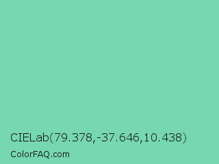 CIELab 79.378,-37.646,10.438 Color is a light green color and the nearest color is Medium Aquamarine #66ddaa. Hex code #76d7b0 and RGB value is rgb(118,215,176). In RGB color space, this color is composed of 46% red, 84% green, 69% blue, In CMYK color space, this color is composed of 45% cyan, 0% magenta, 18% yellow , 16% black , In HSL color space, this color has a hue angle of 156° , 55% saturation and 65% lightness.
