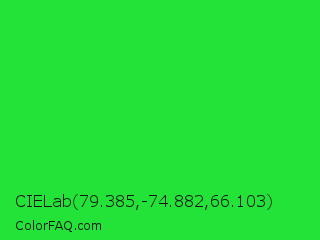 CIELab 79.385,-74.882,66.103 Color is a normal green color and the nearest color is Lime Green #32cd32. Hex code #24e338 and RGB value is rgb(36,227,56). In RGB color space, this color is composed of 14% red, 89% green, 22% blue, In CMYK color space, this color is composed of 84% cyan, 0% magenta, 75% yellow , 11% black , In HSL color space, this color has a hue angle of 126° , 77% saturation and 52% lightness.