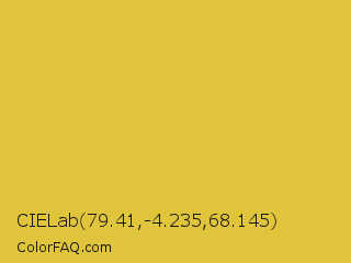 CIELab 79.41,-4.235,68.145 Color is a normal yellow color and the nearest color is Meat Brown #e5b73b. Hex code #e0c43b and RGB value is rgb(224,196,59). In RGB color space, this color is composed of 88% red, 77% green, 23% blue, In CMYK color space, this color is composed of 0% cyan, 13% magenta, 74% yellow , 12% black , In HSL color space, this color has a hue angle of 50° , 73% saturation and 55% lightness.