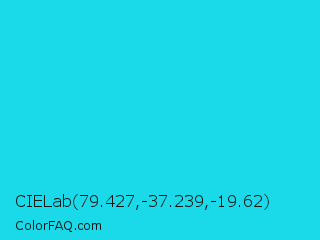 CIELab 79.427,-37.239,-19.62 Color is a normal cyan color and the nearest color is Bright Turquoise #08e8de. Hex code #1ad9e8 and RGB value is rgb(26,217,232). In RGB color space, this color is composed of 10% red, 85% green, 91% blue, In CMYK color space, this color is composed of 89% cyan, 6% magenta, 0% yellow , 9% black , In HSL color space, this color has a hue angle of 184° , 82% saturation and 51% lightness.