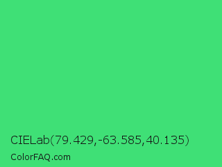 CIELab 79.429,-63.585,40.135 Color is a normal green color and the nearest color is UFO Green #3cd070. Hex code #3fe076 and RGB value is rgb(63,224,118). In RGB color space, this color is composed of 25% red, 88% green, 46% blue, In CMYK color space, this color is composed of 72% cyan, 0% magenta, 47% yellow , 12% black , In HSL color space, this color has a hue angle of 140° , 72% saturation and 56% lightness.
