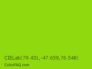 CIELab 79.431,-47.659,76.548 Color is a normal green color and the nearest color is Sheen Green #8fd400. Hex code #91d90f and RGB value is rgb(145,217,15). In RGB color space, this color is composed of 57% red, 85% green, 6% blue, In CMYK color space, this color is composed of 33% cyan, 0% magenta, 93% yellow , 15% black , In HSL color space, this color has a hue angle of 81° , 87% saturation and 45% lightness.