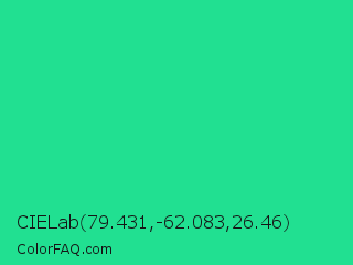 CIELab 79.431,-62.083,26.46 Color is a normal green color and the nearest color is Shamrock #33cc99. Hex code #21e091 and RGB value is rgb(33,224,145). In RGB color space, this color is composed of 13% red, 88% green, 57% blue, In CMYK color space, this color is composed of 85% cyan, 0% magenta, 35% yellow , 12% black , In HSL color space, this color has a hue angle of 155° , 75% saturation and 50% lightness.