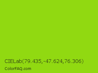CIELab 79.435,-47.624,76.306 Color is a normal green color and the nearest color is Sheen Green #8fd400. Hex code #91d911 and RGB value is rgb(145,217,17). In RGB color space, this color is composed of 57% red, 85% green, 7% blue, In CMYK color space, this color is composed of 33% cyan, 0% magenta, 92% yellow , 15% black , In HSL color space, this color has a hue angle of 82° , 85% saturation and 46% lightness.