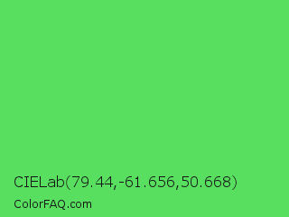 CIELab 79.44,-61.656,50.668 Color is a light green color and the nearest color is Emerald #50c878. Hex code #58df60 and RGB value is rgb(88,223,96). In RGB color space, this color is composed of 35% red, 87% green, 38% blue, In CMYK color space, this color is composed of 61% cyan, 0% magenta, 57% yellow , 13% black , In HSL color space, this color has a hue angle of 124° , 68% saturation and 61% lightness.