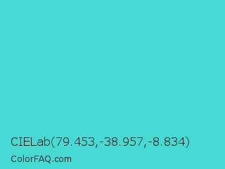 CIELab 79.453,-38.957,-8.834 Color is a normal cyan color and the nearest color is Turquoise #40e0d0. Hex code #47d9d4 and RGB value is rgb(71,217,212). In RGB color space, this color is composed of 28% red, 85% green, 83% blue, In CMYK color space, this color is composed of 67% cyan, 0% magenta, 2% yellow , 15% black , In HSL color space, this color has a hue angle of 178° , 66% saturation and 56% lightness.