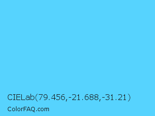 CIELab 79.456,-21.688,-31.21 Color is a light blue color and the nearest color is Turquoise Blue #6cdae7. Hex code #56d3fe and RGB value is rgb(86,211,254). In RGB color space, this color is composed of 34% red, 83% green, 100% blue, In CMYK color space, this color is composed of 66% cyan, 17% magenta, 0% yellow , 0% black , In HSL color space, this color has a hue angle of 195° , 99% saturation and 67% lightness.