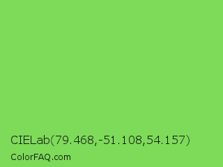 CIELab 79.468,-51.108,54.157 Color is a normal green color and the nearest color is Mantis #74c365. Hex code #7ddb59 and RGB value is rgb(125,219,89). In RGB color space, this color is composed of 49% red, 86% green, 35% blue, In CMYK color space, this color is composed of 43% cyan, 0% magenta, 59% yellow , 14% black , In HSL color space, this color has a hue angle of 103° , 64% saturation and 60% lightness.