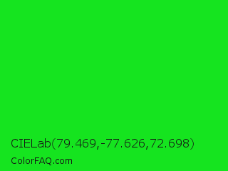CIELab 79.469,-77.626,72.698 Color is a normal green color and the nearest color is Vivid Malachite #00cc33. Hex code #15e41f and RGB value is rgb(21,228,31). In RGB color space, this color is composed of 8% red, 89% green, 12% blue, In CMYK color space, this color is composed of 91% cyan, 0% magenta, 86% yellow , 11% black , In HSL color space, this color has a hue angle of 123° , 83% saturation and 49% lightness.