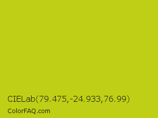 CIELab 79.475,-24.933,76.99 Color is a normal yellow color and the nearest color is Rio Grande #bbd009. Hex code #bfcf15 and RGB value is rgb(191,207,21). In RGB color space, this color is composed of 75% red, 81% green, 8% blue, In CMYK color space, this color is composed of 8% cyan, 0% magenta, 90% yellow , 19% black , In HSL color space, this color has a hue angle of 65° , 82% saturation and 45% lightness.