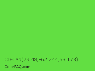 CIELab 79.48,-62.244,63.173 Color is a normal green color and the nearest color is Kiwi #8ee53f. Hex code #62df42 and RGB value is rgb(98,223,66). In RGB color space, this color is composed of 38% red, 87% green, 26% blue, In CMYK color space, this color is composed of 56% cyan, 0% magenta, 70% yellow , 13% black , In HSL color space, this color has a hue angle of 108° , 71% saturation and 57% lightness.