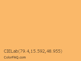 CIELab 79.4,15.592,48.955 Color is a light orange color and the nearest color is Rajah #f7b668. Hex code #fab869 and RGB value is rgb(250,184,105). In RGB color space, this color is composed of 98% red, 72% green, 41% blue, In CMYK color space, this color is composed of 0% cyan, 26% magenta, 58% yellow , 2% black , In HSL color space, this color has a hue angle of 33° , 94% saturation and 70% lightness.