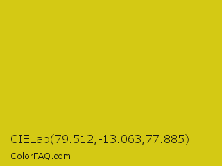 CIELab 79.512,-13.063,77.885 Color is a normal yellow color and the nearest color is Bird Flower #d4cd16. Hex code #d4c914 and RGB value is rgb(212,201,20). In RGB color space, this color is composed of 83% red, 79% green, 8% blue, In CMYK color space, this color is composed of 0% cyan, 5% magenta, 91% yellow , 17% black , In HSL color space, this color has a hue angle of 57° , 83% saturation and 45% lightness.