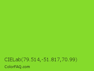 CIELab 79.514,-51.817,70.99 Color is a normal green color and the nearest color is Atlantis #97cd2d. Hex code #85db2b and RGB value is rgb(133,219,43). In RGB color space, this color is composed of 52% red, 86% green, 17% blue, In CMYK color space, this color is composed of 39% cyan, 0% magenta, 80% yellow , 14% black , In HSL color space, this color has a hue angle of 89° , 71% saturation and 51% lightness.