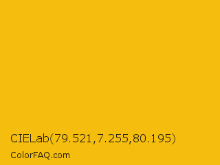 CIELab 79.521,7.255,80.195 Color is a normal yellow color and the nearest color is Mikado Yellow #ffc40c. Hex code #f5bd0d and RGB value is rgb(245,189,13). In RGB color space, this color is composed of 96% red, 74% green, 5% blue, In CMYK color space, this color is composed of 0% cyan, 23% magenta, 95% yellow , 4% black , In HSL color space, this color has a hue angle of 46° , 92% saturation and 51% lightness.