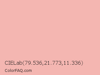 CIELab 79.536,21.773,11.336 Color is a very light red color and the nearest color is Melon #fdbcb4. Hex code #f4b6b1 and RGB value is rgb(244,182,177). In RGB color space, this color is composed of 96% red, 71% green, 69% blue, In CMYK color space, this color is composed of 0% cyan, 25% magenta, 27% yellow , 4% black , In HSL color space, this color has a hue angle of 4° , 75% saturation and 83% lightness.
