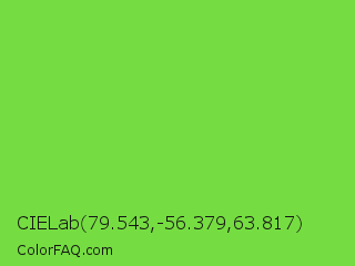 CIELab 79.543,-56.379,63.817 Color is a normal green color and the nearest color is Kiwi #8ee53f. Hex code #75dd41 and RGB value is rgb(117,221,65). In RGB color space, this color is composed of 46% red, 87% green, 25% blue, In CMYK color space, this color is composed of 47% cyan, 0% magenta, 71% yellow , 13% black , In HSL color space, this color has a hue angle of 100° , 70% saturation and 56% lightness.