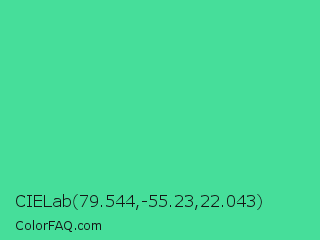 CIELab 79.544,-55.23,22.043 Color is a normal green color and the nearest color is Eucalyptus #44d7a8. Hex code #46de9a and RGB value is rgb(70,222,154). In RGB color space, this color is composed of 27% red, 87% green, 60% blue, In CMYK color space, this color is composed of 68% cyan, 0% magenta, 31% yellow , 13% black , In HSL color space, this color has a hue angle of 153° , 70% saturation and 57% lightness.