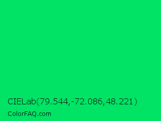 CIELab 79.544,-72.086,48.221 Color is a normal green color and the nearest color is Malachite #0bda51. Hex code #00e365 and RGB value is rgb(0,227,101). In RGB color space, this color is composed of 0% red, 89% green, 40% blue, In CMYK color space, this color is composed of 100% cyan, 0% magenta, 56% yellow , 11% black , In HSL color space, this color has a hue angle of 147° , 100% saturation and 45% lightness.