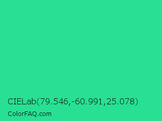 CIELab 79.546,-60.991,25.078 Color is a normal green color and the nearest color is Shamrock #33cc99. Hex code #27e094 and RGB value is rgb(39,224,148). In RGB color space, this color is composed of 15% red, 88% green, 58% blue, In CMYK color space, this color is composed of 83% cyan, 0% magenta, 34% yellow , 12% black , In HSL color space, this color has a hue angle of 155° , 75% saturation and 52% lightness.