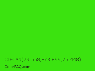 CIELab 79.558,-73.899,75.448 Color is a normal green color and the nearest color is Harlequin Green #46cb18. Hex code #3be30f and RGB value is rgb(59,227,15). In RGB color space, this color is composed of 23% red, 89% green, 6% blue, In CMYK color space, this color is composed of 74% cyan, 0% magenta, 93% yellow , 11% black , In HSL color space, this color has a hue angle of 108° , 88% saturation and 47% lightness.