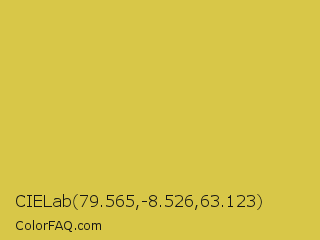CIELab 79.565,-8.526,63.123 Color is a normal yellow color and the nearest color is Wattle #dcd747. Hex code #d8c748 and RGB value is rgb(216,199,72). In RGB color space, this color is composed of 85% red, 78% green, 28% blue, In CMYK color space, this color is composed of 0% cyan, 8% magenta, 67% yellow , 15% black , In HSL color space, this color has a hue angle of 53° , 65% saturation and 56% lightness.