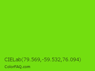 CIELab 79.569,-59.532,76.094 Color is a normal green color and the nearest color is Alien Armpit #84de02. Hex code #73de0f and RGB value is rgb(115,222,15). In RGB color space, this color is composed of 45% red, 87% green, 6% blue, In CMYK color space, this color is composed of 48% cyan, 0% magenta, 93% yellow , 13% black , In HSL color space, this color has a hue angle of 91° , 87% saturation and 46% lightness.