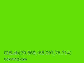 CIELab 79.569,-65.097,76.714 Color is a normal green color and the nearest color is Bright Green #66ff00. Hex code #62e006 and RGB value is rgb(98,224,6). In RGB color space, this color is composed of 38% red, 88% green, 2% blue, In CMYK color space, this color is composed of 56% cyan, 0% magenta, 97% yellow , 12% black , In HSL color space, this color has a hue angle of 95° , 95% saturation and 45% lightness.
