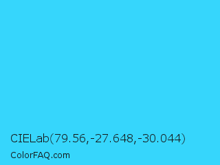 CIELab 79.56,-27.648,-30.044 Color is a normal cyan color and the nearest color is Loeen #15f2fd. Hex code #36d6fc and RGB value is rgb(54,214,252). In RGB color space, this color is composed of 21% red, 84% green, 99% blue, In CMYK color space, this color is composed of 79% cyan, 15% magenta, 0% yellow , 1% black , In HSL color space, this color has a hue angle of 192° , 97% saturation and 60% lightness.