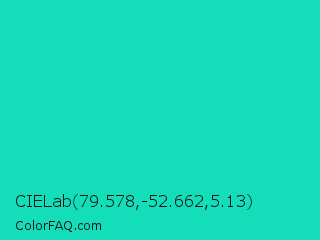 CIELab 79.578,-52.662,5.13 Color is a normal cyan color and the nearest color is Java #1fc2c2. Hex code #14deba and RGB value is rgb(20,222,186). In RGB color space, this color is composed of 8% red, 87% green, 73% blue, In CMYK color space, this color is composed of 91% cyan, 0% magenta, 16% yellow , 13% black , In HSL color space, this color has a hue angle of 169° , 83% saturation and 47% lightness.