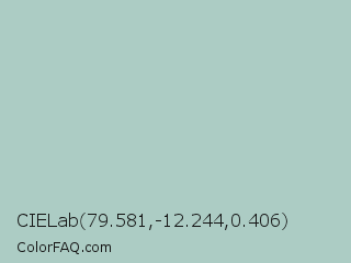CIELab 79.581,-12.244,0.406 Color is a light cyan color and the nearest color is Opal #a9c6c2. Hex code #acccc4 and RGB value is rgb(172,204,196). In RGB color space, this color is composed of 67% red, 80% green, 77% blue, In CMYK color space, this color is composed of 16% cyan, 0% magenta, 4% yellow , 20% black , In HSL color space, this color has a hue angle of 165° , 24% saturation and 74% lightness.