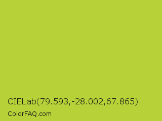 CIELab 79.593,-28.002,67.865 Color is a normal yellow color and the nearest color is Android Green #a4c639. Hex code #b7d139 and RGB value is rgb(183,209,57). In RGB color space, this color is composed of 72% red, 82% green, 22% blue, In CMYK color space, this color is composed of 12% cyan, 0% magenta, 73% yellow , 18% black , In HSL color space, this color has a hue angle of 70° , 62% saturation and 52% lightness.