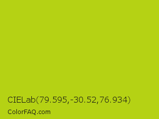 CIELab 79.595,-30.52,76.934 Color is a normal yellow color and the nearest color is Rio Grande #bbd009. Hex code #b5d214 and RGB value is rgb(181,210,20). In RGB color space, this color is composed of 71% red, 82% green, 8% blue, In CMYK color space, this color is composed of 14% cyan, 0% magenta, 90% yellow , 18% black , In HSL color space, this color has a hue angle of 69° , 83% saturation and 45% lightness.