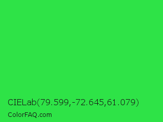 CIELab 79.599,-72.645,61.079 Color is a normal green color and the nearest color is Lime Green #32cd32. Hex code #2ee347 and RGB value is rgb(46,227,71). In RGB color space, this color is composed of 18% red, 89% green, 28% blue, In CMYK color space, this color is composed of 80% cyan, 0% magenta, 69% yellow , 11% black , In HSL color space, this color has a hue angle of 128° , 76% saturation and 54% lightness.
