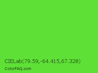 CIELab 79.59,-64.415,67.328 Color is a normal green color and the nearest color is Harlequin Green #46cb18. Hex code #5ee036 and RGB value is rgb(94,224,54). In RGB color space, this color is composed of 37% red, 88% green, 21% blue, In CMYK color space, this color is composed of 58% cyan, 0% magenta, 76% yellow , 12% black , In HSL color space, this color has a hue angle of 106° , 73% saturation and 55% lightness.