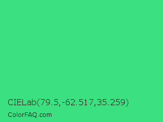CIELab 79.5,-62.517,35.259 Color is a normal green color and the nearest color is UFO Green #3cd070. Hex code #3be080 and RGB value is rgb(59,224,128). In RGB color space, this color is composed of 23% red, 88% green, 50% blue, In CMYK color space, this color is composed of 74% cyan, 0% magenta, 43% yellow , 12% black , In HSL color space, this color has a hue angle of 145° , 73% saturation and 55% lightness.
