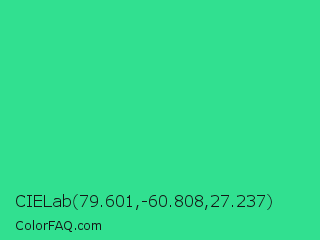 CIELab 79.601,-60.808,27.237 Color is a normal green color and the nearest color is Shamrock #33cc99. Hex code #31e090 and RGB value is rgb(49,224,144). In RGB color space, this color is composed of 19% red, 88% green, 56% blue, In CMYK color space, this color is composed of 78% cyan, 0% magenta, 36% yellow , 12% black , In HSL color space, this color has a hue angle of 153° , 74% saturation and 54% lightness.