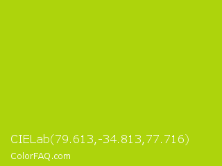 CIELab 79.613,-34.813,77.716 Color is a normal lime color and the nearest color is Vivid Lime Green #a6d608. Hex code #add40c and RGB value is rgb(173,212,12). In RGB color space, this color is composed of 68% red, 83% green, 5% blue, In CMYK color space, this color is composed of 18% cyan, 0% magenta, 94% yellow , 17% black , In HSL color space, this color has a hue angle of 72° , 89% saturation and 44% lightness.